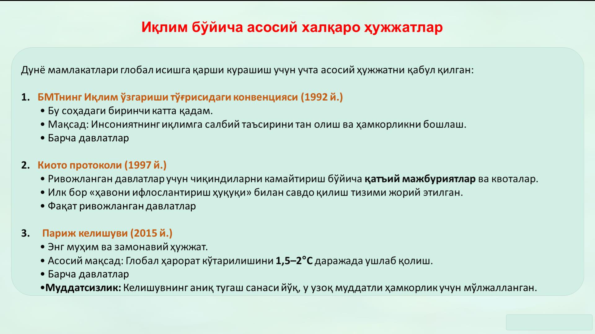Рисбеков А.Ю. выступил с презентацией на тему «Климат и вода». В начале своего выступления он кратко затронул предыдущую тему, посвящённую трансграничным рекам мира и бассейну Аральского моря, подчеркнув их значение для региона. Далее докладчик раскрыл понятие климата, рассмотрел ключевые факторы, вызывающие климатические изменения, а также осветил важнейшие международные документы в области изменения климата.
