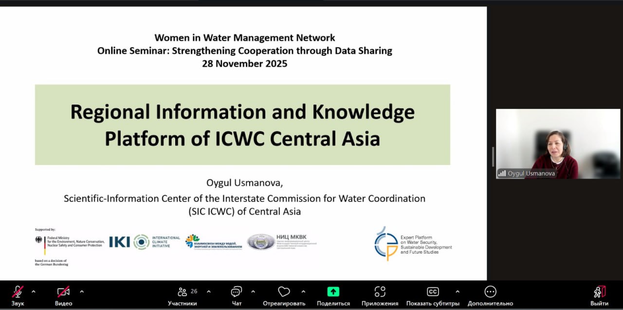 28 ноября 2025 г. Научно-информационный центр Межгосударственной координационной водохозяйственной комиссии Центральной Азии (НИЦ МКВК) принял участие в онлайн-семинаре сети «Женщины в управлении водными ресурсами в Центральной Азии и Афганистане» на тему «Укрепление сотрудничества через обмен данными», организованном в рамках проекта ОБСЕ «Женщины, управление водными ресурсами и предотвращение конфликтов – III фаза».