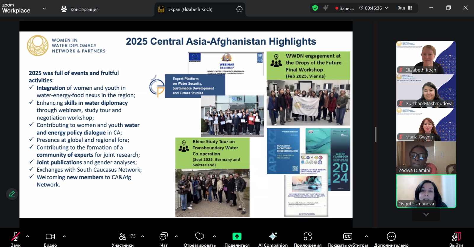 3 декабря 2025 г. состоялась ежегодная онлайн-сессия Сети «Женщины в водной дипломатии» (Women in Water Diplomacy Network, WWDN) «Итоги года – 2025», которая собрала свыше 150 участниц и партнёров сети со всего мира, включая представителей экспертного сообщества, дипломатических структур, международных организаций и региональных инициатив. Мероприятие проходило в формате открытой глобальной встречи и позволило подвести итоги деятельности сети в 2025 г., обсудить достижения региональных подразделений сети и обозначить ключевые направления работы на 2026 г.