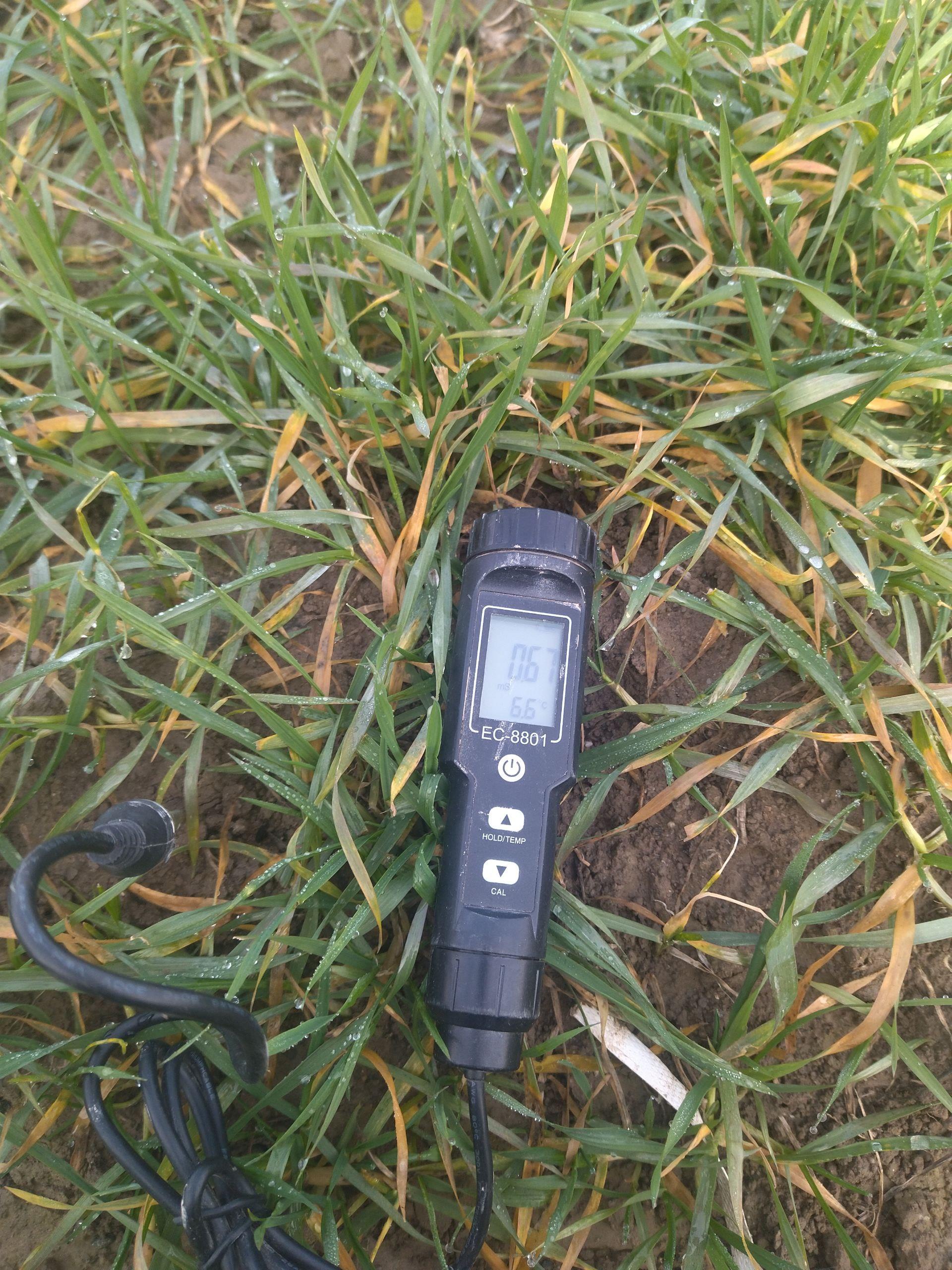 В ходе полевых работ были выполнены детальные фенологические обследования озимой пшеницы на ранних этапах её развития. Особое внимание уделялось наблюдению за ростом и развитием растений при применении различных методов полива. Также были проведены замеры засоления почвы (по показателю электропроводимости).
